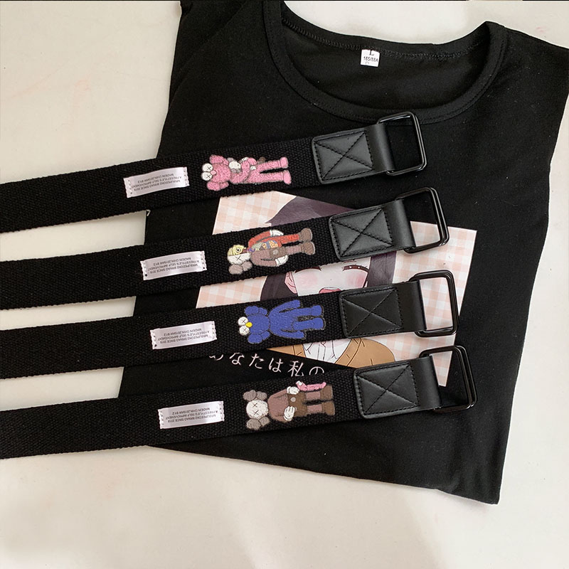 百搭无孔皮带男女通用裤带卡通设计趣味ins原宿风双环扣帆布腰带